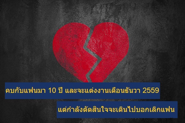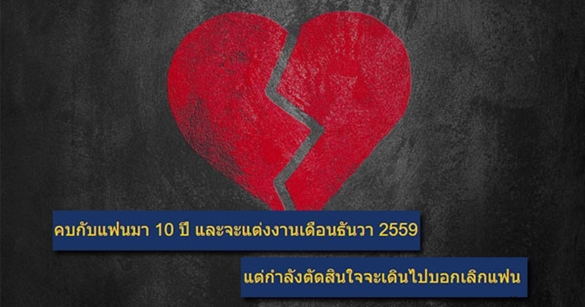 เธอเอาเรื่องไปคุยกับครอบครัว ทุกคนให้เธอถามตัวเองก่อนว่าจริง ๆ อยากแต่งงานไหม แต่งเพราะอะไร เพราะหากแต่งทั้งที่ยังมีคำถามคาใจ จะส่งผลร้ายต่ออนาคต เธอจึงตัดสินใจลองแบกเป้ไปเที่ยวต่างประเทศคนเดียวเป็นครั้งแรกในชีวิต ใช้ชีวิตคนเดียว 1 สัปดาห์ และพบว่า ชีวิตมีอะไรมากกว่าที่คิด อยู่คนเดียวก็สบายดี พอกลับมาก็คิดหนัก อยากบอกแฟนว่า อย่าแจกการ์ดเลย เป็นเพื่อนกันเถอะ จะแต่งงานเพราะคบกันมานานแค่นั้นเหรอ "เราไม่มีความสุขเลย" จึงตัดสินใจว่าวันที่ 13 เมษายน 2559 เป็นวันครบรอบ 10 ปีที่คบกันมา เธอจะบอกเรื่องนี้และหยุดทุกอย่าง จึงอยากขอความเห็นว่า เธอตัดสินใจเร็วไปไหม หรือนี่คืออาการที่คนจะแต่งงานเป็นเหมือนกันหมด