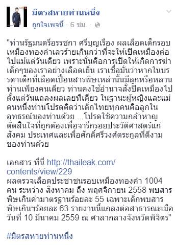 "เรียน ท่าน ดร.อรรชกา สีบุญเรือง รัฐมนตรีว่าการกระทรวงอุตสาหกรรม ผลการตรวจเลือดเด็ก ๆ รอบเหมืองแร่ครั้งล่าสุดนี้ เลวร้ายเกินกว่าจะให้เปิดเหมืองต่อไปแม้แต่วันเดียว"