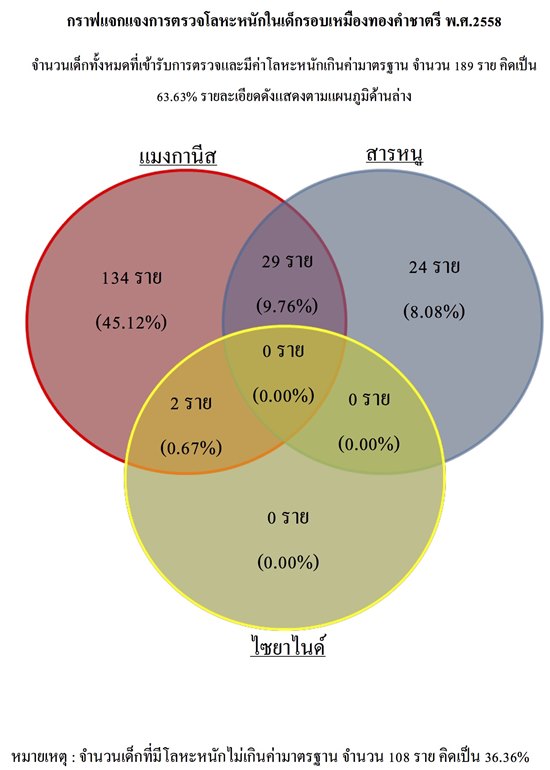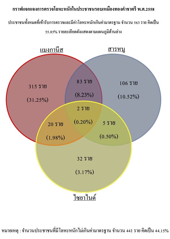 นอกจากนี้ เพจดังกล่าวยังได้แนบลิงก์รายงานผลการตรวจเลือดประจำปี 2558 ทั้งของเด็ก ๆ และชาวบ้านที่อาศัยรอบเหมืองทองคำชาตรี จ.พิจิตร ผ่านทางเว็บไซต์ thaileak.com ซึ่งตามรายงานนั้นเผยให้เห็นว่า ประชาชนที่เข้ารับการตรวจและมีค่าโลหะเกินมาตรฐานทั้งหมด 563 ราย มีรายละเอียดดังนี้