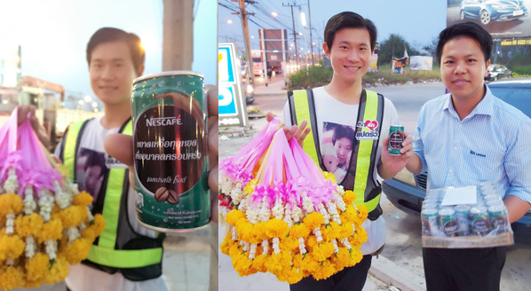 ถนนสิริโสธร ต.โสธร อ.เมือง จ.ฉะเชิงเทรา โดยยอดคุณพ่อจะสวมเสื้อที่สกรีนรูปครอบครัวและยกมือไหว้รถทุกคันที่จอดติดไฟแดงไม่ว่าจะซื้อหรือไม่ซื้อ พร้อมทั้งยืนขายจนกว่าพวงมาลัยจะหมด