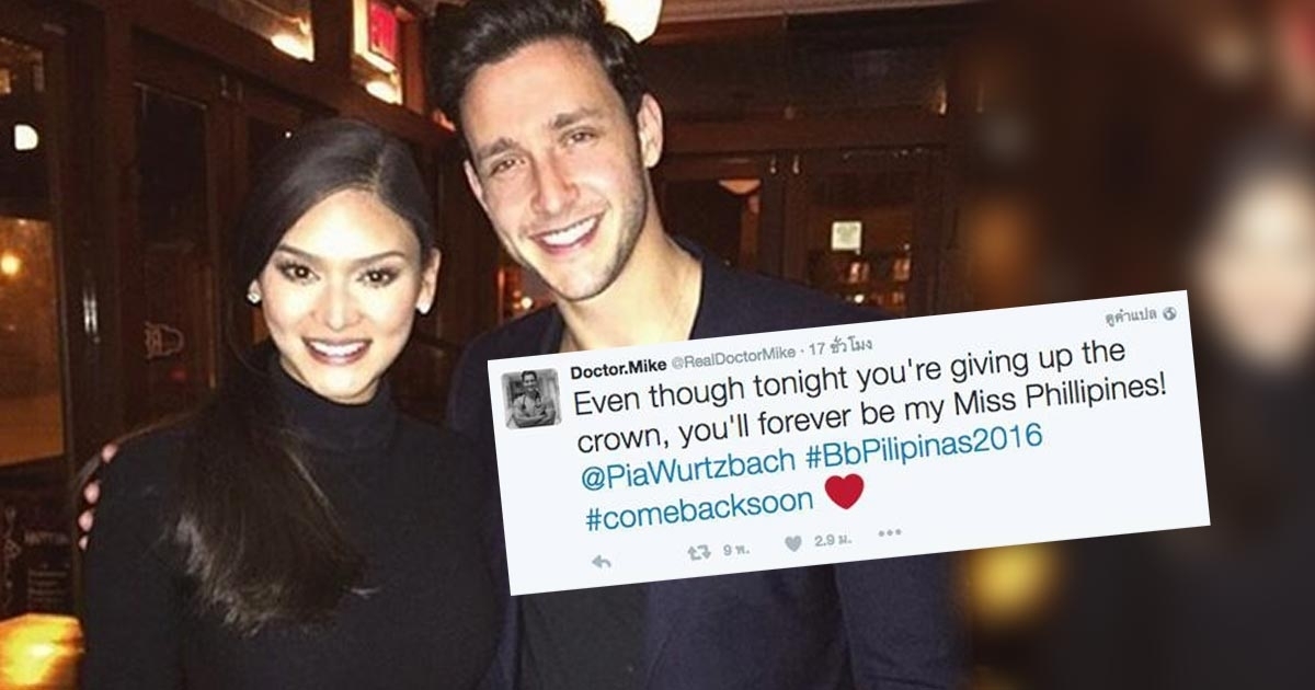 สยบข่าวรักร้าวชะงัดมาก ! หมอไมค์ คุณหมอสุดหล่อโลกออนไลน์ หยอดทวีตสุดหวานถึง ปิอา Miss Universe หลังบินไปมอบมงกุฎให้สาวงามมิสฟิลิปปินส์คนใหม่ บอกถึงมงกุฎจะไป แต่ยังไงคุณก็ยังเป็นมิสฟิลิปปินส์ของผมตลอดกาล
