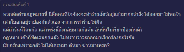 งานนี้ทำเอาคนรักหมาถึงกับมีน้ำโห หลังจากได้อ่านการร่ายยาวของเจ้าของกระทู้ โดยส่วนใหญ่ต่อว่าเจ้าของกระทู้ว่า ไม่ทำความเข้าใจ พ.ร.บ.คุ้มครองสัตว์ ก่อนมาตั้งกระทู้ และยังระบุว่า พวกต่อต้านกฎหมายนี้ คือคนที่ใจจ้องจะทำร้ายสัตว์อยู่แล้วมากกว่าถึงได้ออกมาไม่พอใจ