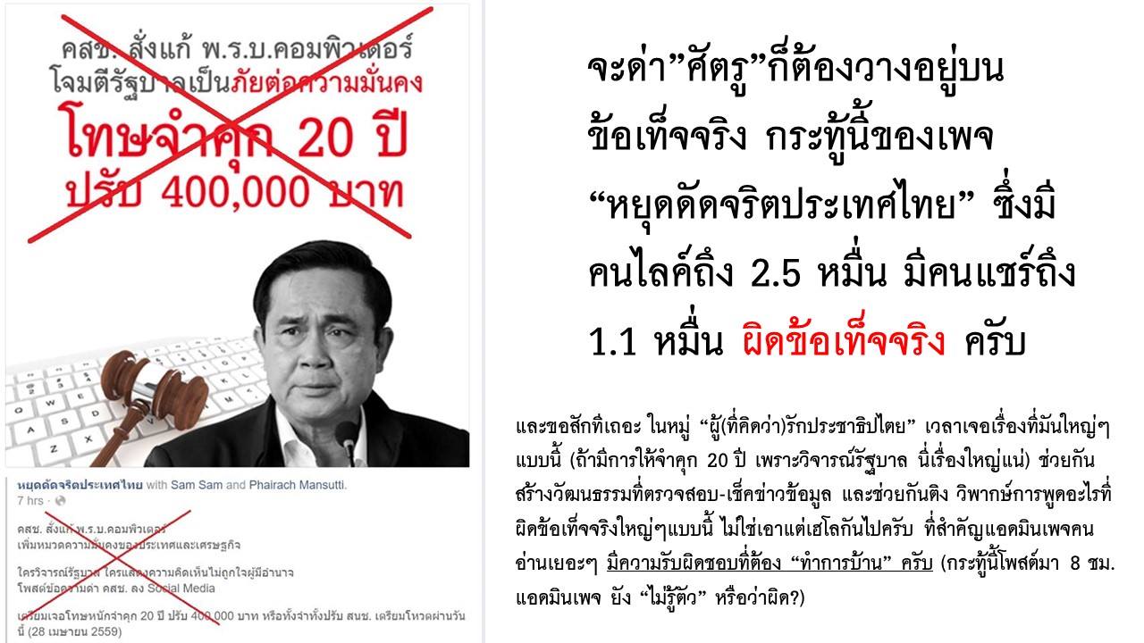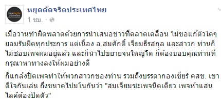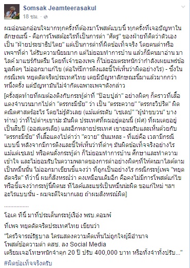 อย่างไรก็ตาม ก่อนหน้านั้น นายสมศักดิ์ เจียมธีรสกุล ได้โพสต์เฟซบุ๊กส่วนตัว ตำหนิ เพจเฟซบุ๊ก "หยุดดัดจริตประเทศไทย" หลังโพสต์ภาพอินโฟกราฟิก ระบุถึง ร่าง พ.ร.บ.คอมพิวเตอร์ฉบับใหม่ ที่มีเนื้อหาว่า คสช. สั่งแก้ พ.ร.บ.คอมพิวเตอร์ โจมตีรัฐบาล เป็นภัยต่อความมั่นคง โทษจำคุก 20 ปี ปรับ 4 แสนบาท ว่า ตนอ่อนอกอ่อนใจมากที่มีการโพสต์ด่าศัตรูของฝ่ายที่คิดว่าตัวเองเป็นประชาธิปไตย แต่เป็นการด่าที่ผิดข้อเท็จจริง โดยคนที่โพสต์นั้นเป็นเพจที่ได้รับความนิยมมาก แต่กลับไม่ยอมทำการบ้าน และไม่เคยตระหนักว่า ได้มีการเผยแพร่ข้อมูลผิด ๆ อีกทั้งยังไม่มีการแก้ไขเนื้อหาต่อให้มีการออกมาติติงและชี้ให้เห็นว่าผิด