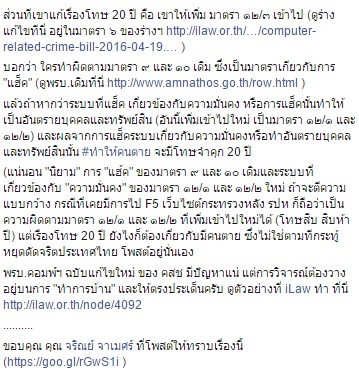 วันนี้ (29 เมษายน 2559) ผู้สื่อข่าวรายงานว่า หลังจากศาลทหารได้อนุมัติหมายจับกลุ่มแอดมินเพจเฟซบุ๊กที่มีการโพสต์ข้อความวิพากษ์วิจารณ์รัฐธรรมนูญและการทำประชามติ โดยในระหว่างการแถลงข่าวนั้น เจ้าหน้าที่ตำรวจได้มีการเผยแผนผังความเชื่อมโยงของกลุ่มคนดังกล่าวในความผิดตามประมวลกฎหมายอาญา มาตรา 116 และ พ.ร.บ.คอมพิวเตอร์ พ.ศ. 2550 หลังจากจับกุมทั้ง 8 คน (อ่านข่าว เผยผังเครือข่ายมือโพสต์ ดิสเครดิตรัฐบาล ชี้มีคนชักใยเบื้องหลัง)