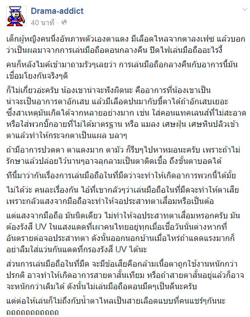 สาวโพสต์เตือนภัย ! อันตรายจากการเล่นโทรศัพท์ในที่มืดเป็นเวลานานบวกกับใส่คอนแทคเลนส์ จนตาแดงมีเลือดไหลออกจากตา ด้านเฟซบุ๊ก Drama-addict ชี้ อาจเข้าใจผิด