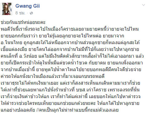 เมื่อวันที่ 7 พฤษภาคม 2559 เฟซบุ๊ก Gwang Gii ได้มีการโพสต์ข้อความหลังจากที่ได้คุยกับยายคนหนึ่ง ขณะกำลังเข้าเมืองนครราชสีมาว่า ยายนั้นถูกลูกสะใภ้ไล่ออกจากบ้าน ส่วนลูกชายก็เชื่อแต่เมีย ดังนั้น ยายจึงจะไปหาลูกชายคนเล็กที่ อ.วังน้อย เงินไม่มี เสื้อผ้าไม่ได้เอามา มีเพียงขวดน้ำ 1 ขวดกับยาดมเท่านั้น พร้อมวอนให้คนที่พบเห็นช่วยเหลือยายด้วย