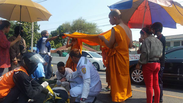 แล้วลงมาช่วยเหลืออย่างไม่รอช้า ถอดสบงช่วยกาง 4 มุมบังแดดให้ผู้บาดเจ็บ