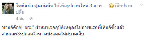 สุดยอด ! สามเณรถอดจีวรกางบังแดด แก่ผู้ประสบอุบัติเหตุบนถนน หลังนั่งรถตุ๊กตุ๊กผ่านมา สร้างเสียงชื่นชมทั่วโลกอินเทอร์เน็ต เมื่อวันที่ 12 พฤษภาคม 2559 เฟซบุ๊ก โพธิ์แก้ว ศูนย์หนึ่ง ได้มีการโพสต์ภาพสามเณร 3 รูป ถอดจีวรบังแดดแก่ผู้บาดเจ็บบนถนน สร้างเสียงชื่นชมไปทั่วโลกโซเชียลเน็ตเวิร์ก