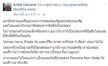 วันนี้ (15 พฤษภาคม 2559) ผู้สื่อข่าวรายงานว่า ดร.อาทิตย์ อุไรรัตน์ อธิการบดีมหาวิทยาลัยรังสิตและอดีตประธานรัฐสภา ได้โพสต์ข้อความผ่านเฟซบุ๊กส่วนตัวระบุว่า เอกอัครราชทูตคือผู้แทนจากประมุขของรัฐต่อประมุขของรัฐและโดยเฉพาะไทยเรามีพระมหากษัตริย์เป็นประมุข ไม่ว่าประเทศไทยจะเล็กหรือจนกว่าอย่างไร เราก็เป็นประเทศที่มีอธิปไตยและมีศักดิ์ศรีทัดเทียมกันใครจะมาหยาม กักขฬะ กุ๊ย แสดงกิริยามารยาทที่ถ่อย กำพืดต่ำ ต่อเราไม่ได้ ประเทศไทยในฐานะที่มีวัฒนธรรมเก่าแก่ดีงามมาก่อนสหรัฐฯ เราต้องสอนให้สหรัฐฯ รู้ได้ ว่า การส่งคนไม่มีมารยาทมาเป็นเอกอัครราชทูต ถือว่าดูถูกเรา เราควรตอบโต้โดยแจ้งว่าเป็นบุคคลไม่พึงประสงค์ Persona Non Grata ให้สหรัฐฯ เอาตัวกลับ