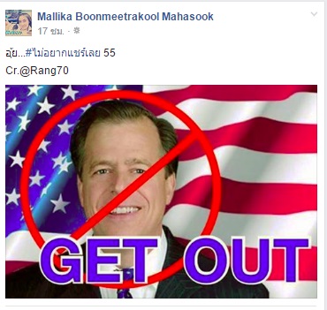 ขณะที่ นางมัลลิกา มหาสุข หรือ มัลลิกา บุญมีตระกูล รองโฆษกพรรคประชาธิปัตย์ ก็ได้โพสต์ข้อความและภาพลงเพจเฟซบุ๊กชื่อ Mallika Boonmeetrakool เป็นภาพหน้าของนายเกล็น ทาวน์เซนด์ เดวี่ส์ เอกอัครราชทูตสหรัฐฯ ประจำประเทศไทย พร้อมข้อความ Get Out