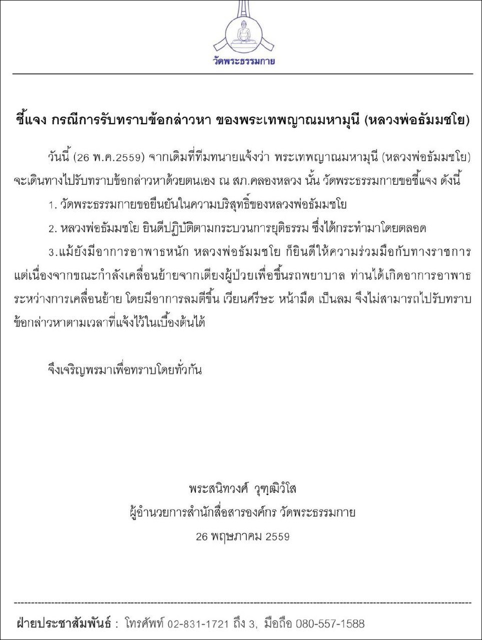 เวลา 15.30 น. สำนักสื่อสารองค์กร วัดพระธรรมกาย ได้แถลงชี้แจงกรณีดังกล่าวว่า พระธัมมชโย ป่วยจริง หน้ามืดเป็นลม ไม่สามารถเคลื่อนย้ายไปได้ ซึ่งท่านป่วยหนักแบบนี้มาตั้งแต่แรกแล้ว ขาบวมอย่างหนัก เสี่ยงติดเชื้อ โดยแพทย์ยืนยันต้องให้การรักษาอย่างฉับพลันในขณะนี้ ด้วยอาการของท่านแท้จริงแล้วต้องไปโรงพยาบาล แต่เป็นสิทธิของผู้ป่วย ที่สามารถเลือกการรักษาได้ ทั้งแพทย์ สถานที่ ตามแต่ปรารถนา ซึ่งท่านเลือกรักษาตัวอยู่ที่วัด อย่างไรก็ตามหลังจากนี้ พระธัมมชโย ขอให้เป็นไปตามกระบวนการยุติธรรม ที่ผ่านมาได้แสดงให้เห็นว่า พระธัมมชโย พร้อมให้ความร่วมมือไม่หลบหนีมาโดยตลอด รวมถึงวันนี้เอง ที่ท่านได้นัดหมายเข้ามอบตัวที่ สภ.คลองหลวง แต่ก็อย่างที่ทราบ ท่านอาพาธกะทันหันซึ่งเป็นเหตุที่ไม่ทราบมาก่อน
