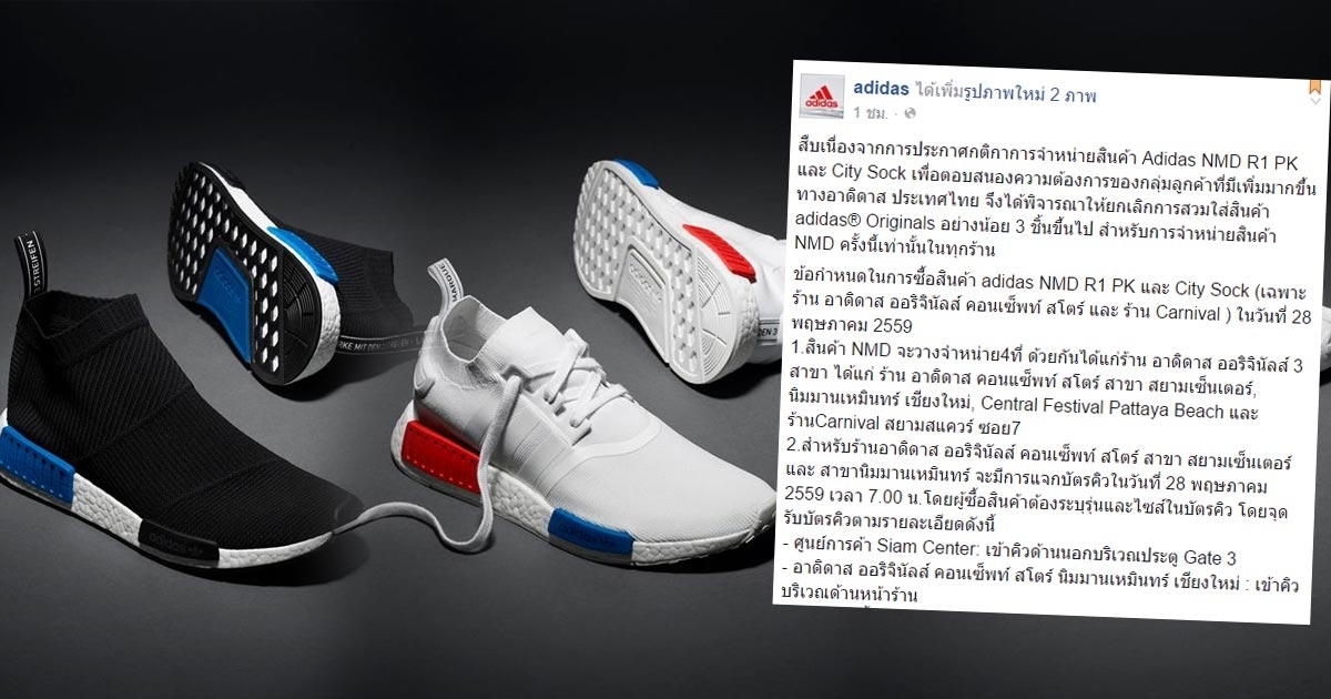 จากกรณีที่ถูกวิพากษ์วิจารณ์อย่างหนัก เมื่อรองเท้าแบรนด์ดัง อาดิดาส ได้ออกกฎเหล็กสำหรับผู้ที่จะซื้อรองเท้ารุ่นใหม่ Adidas NMD R1 PK และ City Sock ซึ่งจะวางจำหน่ายพร้อมกันทั่วโลกในวันที่ 28 พฤษภาคม 2559 ให้ผู้ที่จะมาต่อคิวซื้อนั้น บนตัวจะต้องมีสินค้าแบรนด์อาดิดาส 3 ชิ้นขึ้นไป ซื้อได้ 1 ชิ้น ต่อ 1 คน และห้ามลองสินค้าเด็ดขาด ซึ่งกฎดังกล่าวได้สร้างความไม่พอใจอย่างหนักแก่แฟนคลับที่ต้องการซื้อ ถึงขั้นที่บางคนเตรียมโบกมือลา ขอหันหน้าซบแบรนด์อื่นแทนนั้น [อ่าน อาดิดาส ตั้งกฎซื้อรองเท้ารุ่นใหม่ ต้องมีแบรนด์ออริจินัล 3 ชิ้นบนตัว]