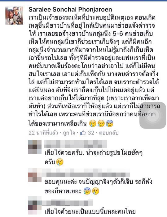 นอกจากนี้ เจ้าของรถเห็ดที่ประสบอุบัติเหตุ ได้โพสต์เกี่ยวกับเรื่องดังกล่าวว่า ก่อนเกิดเหตุมีชาวบ้านช่วยแจ้งตำรวจ และช่วยเก็บเห็ดให้ประมาณ 5-6 คน แต่ว่าจู่ ๆ ก็มีคนจากไหนไม่รู้มาเก็บเห็ดเอาขึ้นรถไปเลย ทั้งที่มีตำรวจอยู่ และทางเราก็ตะโกนแล้วว่าอย่าเอาไป สุดท้ายตำรวจได้แต่ยืนดู เพราะห้ามไม่ได้