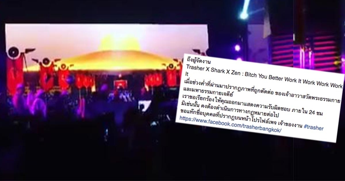 ด้าน นายองอาจ ธรรมนิทา โฆษกคณะศิษยานุศิษย์วัดพระธรรมกาย ออกแถลงการณ์ วัดพระธรรมกายว่า จากกรณีการจัดกิจกรรมปาร์ตี้ เพื่อความบันเทิง ที่อ้างเป็นความสนุกแปลกใหม่ โดยกำหนดรูปแบบการแต่งกายด้วยยูนิฟอร์มต่าง ๆ โดยมีผู้ดำเนินการที่ใช้ชื่อกลุ่มว่า Trasher Bangkok เมื่อวันที่ 20 พฤษภาคม 2559 ณ เซน อีเว้นท์ แกลลอรี่ ชั้น 8 เซ็นทรัลเวิลด์ กรุงเทพฯ ในกิจกรรมดังกล่าวได้มีการนำภาพตัดต่ออันเป็นเท็จของ พระธัมมชโย มาประกอบการแสดงบนเวที เพื่อบิดเบือนให้ประชาชนเข้าใจผิดจากความเป็นจริง อันเป็นการกระทำที่จงใจดูหมิ่นและสร้างความเสื่อมเสียให้กับพระธัมมชโย