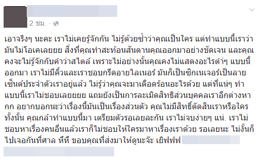 อย่างไรก็ตาม ล่าสุดเจ้าของภาพดังกล่าวได้ทราบเรื่องทั้งหมดแล้ว พร้อมได้เขียนข้อความบอกชัดว่าไม่โอเคกับเรื่องนี้ ไม่เข้าใจว่าคนโพสต์จะมาเดือดร้อนอะไรกับการแต่งหน้าอันเป็นซิกเนเจอร์ของตัวเอง แต่ที่แน่ ๆ ทำแบบนี้เธอไม่ชอบเลย แถมยังเป็นการละเมิดสิทธิส่วนบุคคลอีกด้วย ถ้ากล้าทำกันถึงขนาดนี้ก็ขอให้เตรียมตัวรอได้ เพราะเรื่องนี้ไม่จบง่าย ๆ แน่ ไม่เช่นนั้นก็ไปเจอกันที่ศาล