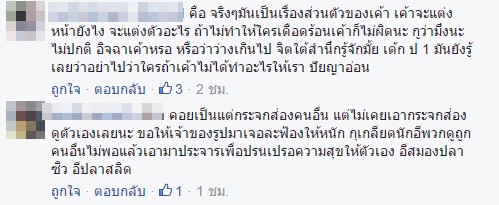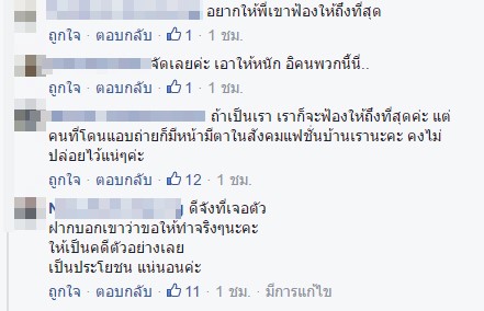 นอกจากนี้ชาวเน็ตยังสนับสนุนให้เจ้าของภาพที่ถูกนำมาวิจารณ์ผ่านเฟซบุ๊ก ฟ้องร้องบุคคลที่แอบถ่ายและโพสต์ภาพดังกล่าว เพื่อเป็นการให้บทเรียนแก่กลุ่มคนที่ชอบนำรูปของชาวบ้านมาประจานลงเฟซบุ๊กอีกด้วย