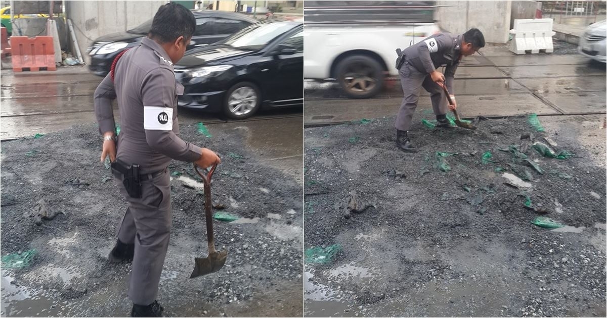 ชาวเน็ตแชร์เรื่องราวน่าชื่นชม เมื่อนายตำรวจยศร้อยตำรวจโทลงมือขนดินมากลบหลุมขนาดใหญ่ที่บริเวณถนนแยกปู่เจ้าฯ-สุขุมวิท จากการกัดเซาะของน้ำฝน เพื่อให้รถสัญจรผ่านได้