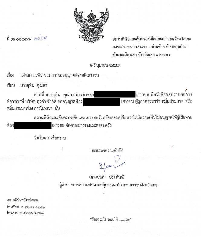 โดยหนังสือดังกล่าวระบุว่า สถานพินิจและคุ้มครองเด็กและเยาวชนจังหวัดเลยมีความเห็นไม่อนุญาตให้ผู้เสียหายฟ้องน้องพลอยต่อศาลเยาวชนและครอบครัว