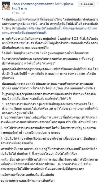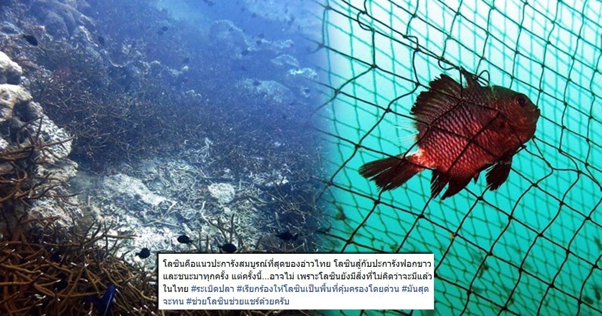 พร้อมกันนี้ ดร.ธรณ์ ยังแนบภาพใต้ทะเลจากพื้นที่เกาะโลซิน ที่แสดงให้เห็นว่าแนวปะการังถูกทำลายจากแรงระเบิดจนโหว่เป็นหลุม และยังมีภาพของปลาตัวน้อยขณะติดอวน ดูแล้วชวนเศร้าใจไม่น้อยทีเดียว
