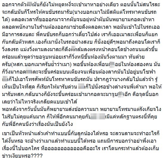 หลังจากนั้น เธอสังเกตว่าหัวหน้าสังกัดมีอาการมึนเมาได้ที่ ก่อนเข้ามาลวนลามเธอด้วยการกอดและหอมแก้ม และหนักไปถึงขั้นล้วงหน้าอกกับของสงวน จนตัวเธอต้องดิ้นสุดชีวิต โชคดีมีพนักงานและการ์ดในร้านเข้ามาช่วยเหลือได้ทันเวลา