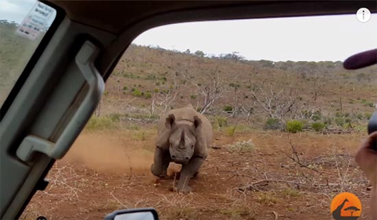 เมื่อเห็นว่าเป็นโชคดีที่ได้พบแรดดำ ซึ่งเป็นสัตว์ใกล้สูญพันธุ์แล้ว พวกเขาก็ได้จอดรถจี๊ปเพื่อถ่ายรูปของแรดดำตัวนี้ไว้ แล้วนาทีระทึกที่ไม่คาดฝันก็เกิดขึ้น เมื่อเจ้าแรดดำตัวนี้เห็นรถจี๊ปของพวกเขาเข้า มันเลยวิ่งพุ่งตรงมา อย่างรวดเร็วและไม่ยั้ง ชนรถเข้าอย่างจัง คาดว่าเจ้าแรดดำตัวนี้คงจะคิดว่ารถจี๊ปเป็นศัตรูของมันแน่ ๆ