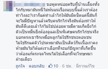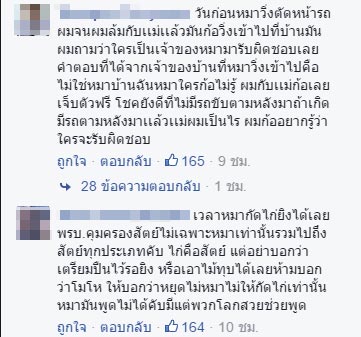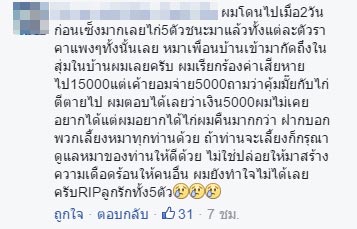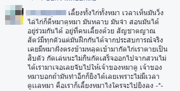 ขณะที่ในเวลาต่อมา เจ้าของเฟซบุ๊กรายดังกล่าวก็ได้เผยต่อผู้สื่อข่าวเดลินิวส์ออนไลน์ ว่าในช่วง 2-3 เดือนที่ผ่านมา มีสุนัขหลายตัววนเวียนกันเข้ามากัดกินไก่ของตน ซึ่งแม้จะเรียกร้องค่าเสียหายจากเจ้าของสุนัข แต่อีกฝ่ายกลับกล่าวหาว่าตนใจดำ มีแต่จะปวดหัว จนภายหลังได้เจรจากับเจ้าของสุนัขเรียบร้อย ฝ่ายนั้นยินยอมจ่ายค่าเสียหายให้ แต่ขอผ่อนชำระเป็น 2 งวด และเข้าใจกันดีแล้ว เพราะต่างคนก็ต่างสูญเสีย เขาเสียเงินซึ่งไม่น่าจะต้องเสีย ส่วนตนเสียไก่ที่คอยดูแลและประคบประหงมมาอย่างดีโดยตลอด