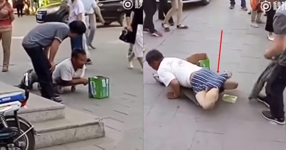 แฉกลขอทานแสร้งพิการขาด้วน อาศัยไถตัวไปกับแผ่นกระดานสุดน่าเวทนา ที่แท้มีขาปกติ แต่พับซุกไว้ในกางเกง โดนจับถอดกางเกงแฉประจานจะจะ ยังไถกระดานหนีอย่างไว