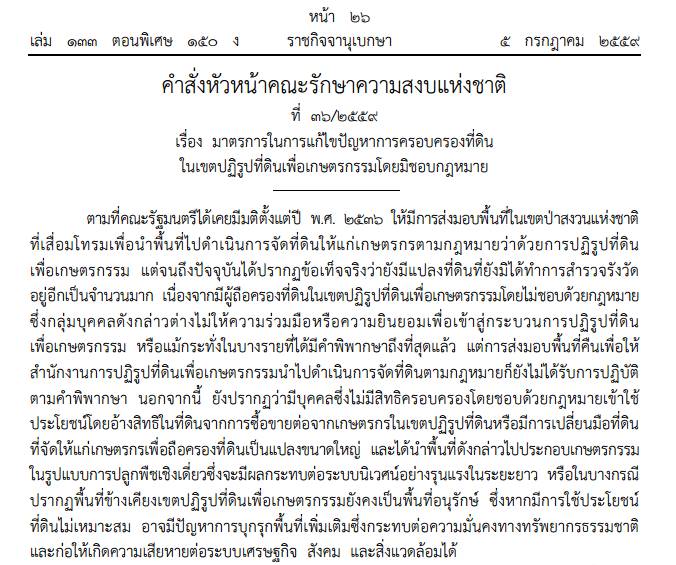 วันที่ 5 กรกฎาคม 2559 เว็บไซต์ราชกิจจานุเบกษา ได้มีประกาศคําสั่งหัวหน้าคณะรักษาความสงบแห่งชาติ ที่ 36/2559 เรื่อง มาตรการในการแก้ไขปัญหาการครอบครองที่ดิน ในเขตปฏิรูปที่ดินเพื่อเกษตรกรรมโดยมิชอบด้วยกฎหมาย โดยมีสาระสำคัญคือ เมื่อปี พ.ศ. 2536 คณะรัฐมนตรี ได้มีการส่งมอบพื้นที่ในเขตป่าสงวนแห่งชาติที่เสื่อมโทรมเพื่อนำพื้นที่ไปจัดให้กับเกษตรกรตามกฎหมายว่าด้วยการปฏิรูปที่ดินเพื่อเกษตรกรรม แต่ในปัจจุบันพบว่ายังมีที่ดินที่ยังไม่ได้ทำการสำรวจรังวัดอยู่เป็นจำนวนมาก เนื่องจากมีผู้ถือครองที่ดินดังกล่าวอย่างไม่ชอบด้วยกฎหมาย ซึ่งไม่ได้ให้ความร่วมมือในการปฏิรูปที่ดิน หรือแม้กระทั่งในบางรายได้คำพิพากษาสิ้นสุดแล้ว แต่การส่งมอบที่ดินคืนให้สำนักงานการปฏิรูปที่ดินเพื่อเกษตรกรรมนำไปดำเนินการต่อไปนั้น ยังไม่ได้รับการกฏิบัติตามคำพิพากษา