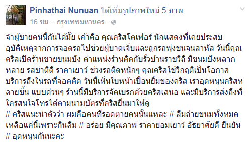 กำลังเป็นที่แชร์ต่อในโลกออนไลน์ขณะนี้ สำหรับข่าวคราวอัพเดทของ คริสโตเฟอร์ แจ๊ค เบญจกุล อดีตนักแสดงที่ประสบอุบัติเหตุเพราะลงไปช่วยเหลือผู้บาดเจ็บริมถนน แล้วโดนรถจักรยานยนต์ซิ่งชนจนร่างกายพิการ ซึ่งล่าสุด (12 กรกฎาคม 2559) เฟซบุ๊ก Pinhathai Nunuan ก็ได้เปิดเผยว่า ขณะนี้คริสโตเฟอร์ได้เข้ามาทำงานในร้านขายขนมปัง 60 Plus Bakery ซึ่งอยู่ติดกับบ้านราชวิถี ซึ่งขนมปังที่ขายนั้นก็มีหลากหลาย แถมยังราคาไม่แพงนัก หากใครสนใจอุดหนุนก็สามารถตามไปได้ถึงร้าน หรือจะสั่งซื้อก็ยังได้