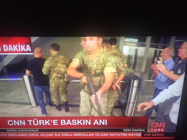09.22 น. ทหารบุกเข้ายึดห้องส่งภายในสถานีโทรทัศน์ซีเอ็นเอ็น เติร์ก ขณะกำลังรายงานสดเหตุการณ์ที่เกิดขึ้นภายในประเทศ ขณะภาพที่ถูกถ่ายทอดควบคู่กันผ่านเฟซบุ๊กไลฟ์เผยให้เห็นห้องส่งไร้นักข่าว เหลือเพียงโต๊ะอ่านข่าวกับฉากหลัง และได้ยินเสียงปืนและระเบิดดังลอดออกมาจากไมค์ผู้สื่อข่าวที่ยังเปิดทิ้งไว้ โดยก่อนทหารบุกเข้ามา ผู้รายงานข่าวยังระบุ ไม่รู้ว่าจะยังออกอากาศได้อีกนานแค่ไหน แต่จะพยายามทำหน้าที่จนถึงนาทีสุดท้าย