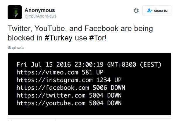08.13 น. TNT สถานีโทรทัศน์แห่งชาติตุรกี กลับมาเป็นปกติหลังโดนระงับออกอากาศไป ซึ่งแหล่งข่าวจากรัฐบาลระบุว่าเป็นฝีมือของกลุ่มก่อรัฐประหาร ผู้รายงานข่าวในสถานีถูกควบคุมตัวเอาไว้ ขณะมีรายงานจากในทวิตเตอร์ระบุว่า สื่อโซเชียลต่าง ๆ ในตุรกี ทั้งเฟซบุ๊ก ทวิตเตอร์ ยูทูบ วิดีโอ อินสตาแกรม ถูกบล็อกไว้ทั้งหมดในช่วงที่มีความพยายามก่อรัฐประหาร
