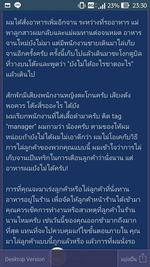 เมื่อวันที่ 23 กรกฎาคม 2559 ในโลกอินเทอร์เน็ตต่างมีการแชร์กระทู้ ร้านสเต๊กที่ XX เค้าไล่ลูกค้าออกจากร้านครับ ซึ่งโพสต์โดย คุณ [Super Devil Ood] สมาชิกเว็บไซต์พันทิปดอทคอม โดยเล่าว่า วันที่ 19 กรกฎาคม ได้ไปทานสเต๊กที่ร้านอาหารแห่งหนึ่งในห้างสรรพสินค้าชื่อดังพร้อมกับครอบครัว อย่างไรก็ตาม เกิดความไม่ต่อเนื่องของการเสิร์ฟอาหารขึ้น และมีพนักงานมาเก็บจาน พร้อมกับชะโงกดูบิล ทั้งที่อาหารยังไม่ครบ ซึ่งเจ้าตัวมองว่า เป็นการส่งสัญญาณไล่ออกจากร้าน