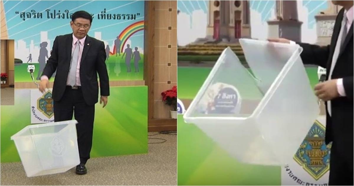 ขำกันลั่นห้อง ! นายสมชัย ศรีสุทธิยากร กรรมการการเลือกตั้ง โชว์โยนหีบบัตรลงคะแนนประชามติทดสอบความแข็งแรง แต่ดันแตกกระจายต่อหน้าสื่อ