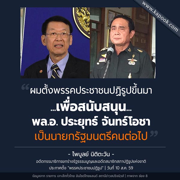 เมื่อวันที่ 9 สิงหาคม 2559 นายไพบูลย์ นิติตะวัน อดีตกรรมาธิการยกร่างรัฐธรรมนูญและอดีตสมาชิกสภาปฏิรูปแห่งชาติ (สปช.) แถลงว่า หลังจากร่างรัฐธรรมนูญผ่านประชามติแล้ว ก็ได้หารือกับผู้ที่มีอุดมการณ์เดียวกัน ส่วนตัวนั้นจะไม่รับตำแหน่ง ส.ว. แต่จะลงสมัคร ส.ส. และจะร่วมจัดตั้งพรรคการเมืองโดยประชาชนเพื่อประชาชน โดยใช้ชื่อพรรคว่า "พรรคประชาชนปฏิรูป"