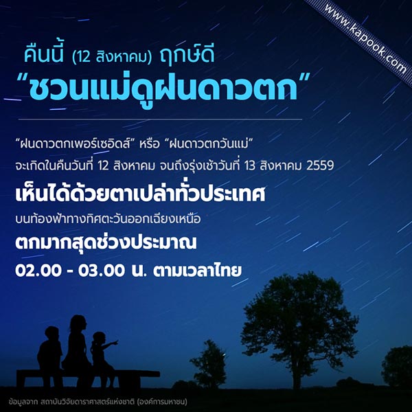 ชวนชม "ฝนดาวตกวันแม่" หรือ ฝนดาวตกเพอร์เซอิดส์ หลังเที่ยงคืนวันที่ 12 สิงหาคม ต่อเนื่องถึงเช้า 13 สิงหาคม 2559 คาดมีอัตราตกสูงสุดถึง 150 ดวง/ชั่วโมง