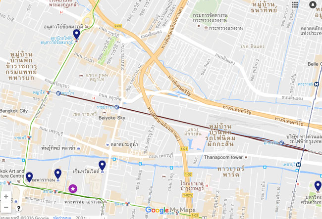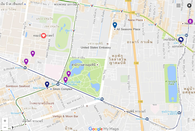 หมายเหตุ สีม่วงหมายถึงสถานีรถไฟฟ้า MRT, สีน้ำเงินคือสถานีรถไฟฟ้าบีทีเอส
