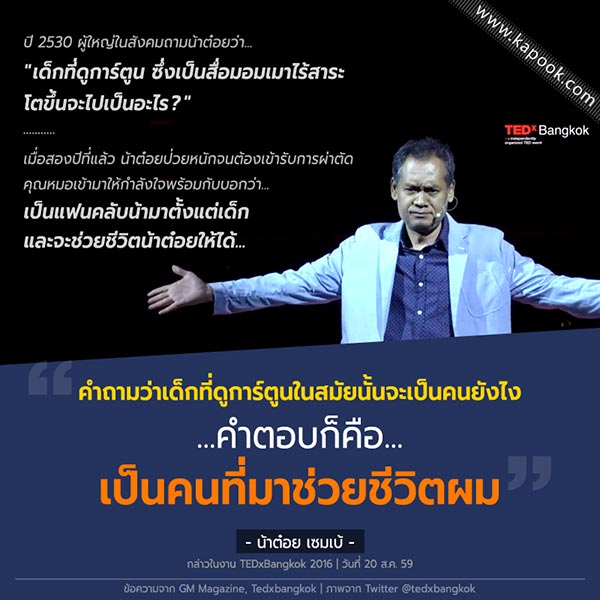 แฟนคลับประทับใจ น้าต๋อย เซมเบ้ นักพากย์การ์ตูนชื่อดัง ปรากฏตัวในงาน TEDxBangkok 2016 เผยเรื่องราวตอนล้มป่วย บอกนึกถึง ซุนโกคู ที่เกือบตายแต่ยังสู้ แล้วตนที่เป็นคนพากย์จะไม่สู้ได้อย่างไร