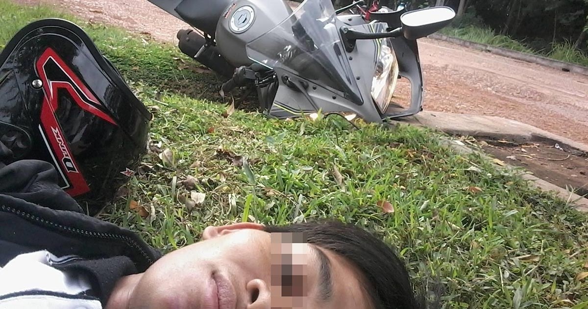ไม่รู้จะฮาหรือสงสารดี หนุ่มขี่มอเตอร์ไซด์ล้ม ตัวกลิ้งลงมานอนพื้น แต่ยังมีอารมณ์ถ่ายเซลฟี่บอกอรุณสวัสดิ์โซเชียล พร้อมเตือนให้ขับรถระมัดระวัง