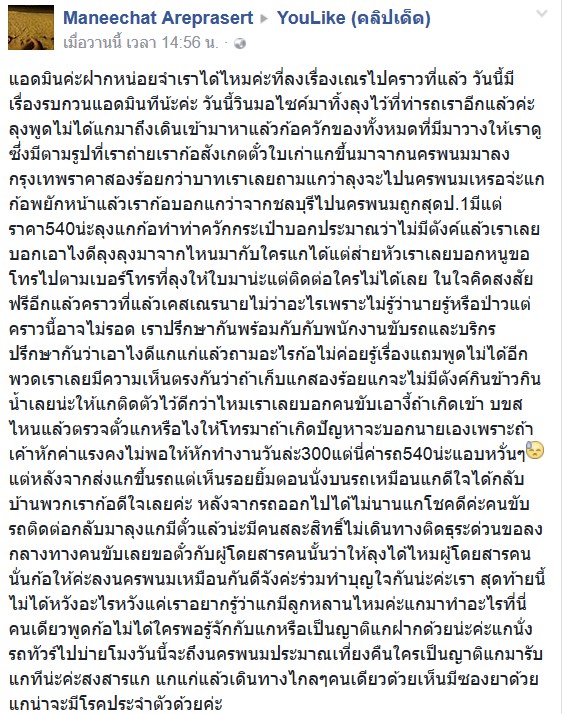 วานนี้ (24 สิงหาคม 2559) โลกออนไลน์ได้มีการแชร์ต่อเรื่องราวความมีน้ำใจของคนไทย ที่ผู้ใช้เฟซบุ๊ก Maneechat Areprasert ได้นำมาเปิดเผยให้ได้รู้กัน หลังจากที่เจ้าของเรื่องซึ่งเป็นพนักงานขายตั๋วรถทัวร์ ได้พบกับคุณลุงรายหนึ่งที่ต้องการเดินทางไปที่ จ.นครพนม แต่ลุงซึ่งพูดไม่ได้คนนี้มีเงินไม่เพียงพอ แถมติดต่อใครไม่ได้