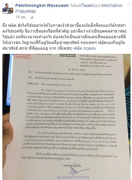 ภาพและข้อมูลจาก เฟซบุ๊ก Metchanon Prajuablap, เพจ ฟลุ๊ค กะล่อน
