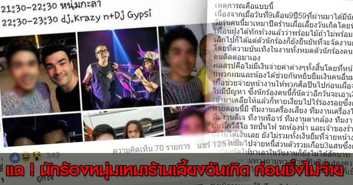 แฉพฤติกรรมฉาวนักร้องหนุ่มเหมาปิดร้านอาหารจัดงานเลี้ยงวันเกิด-จ้างดาราร่วมงาน พองานเลิกกลับชิ่งหนีไม่จ่าย 3 แสนบาท ล่าสุดครอบครัวรับผิดชอบจ่ายแทนแล้ว