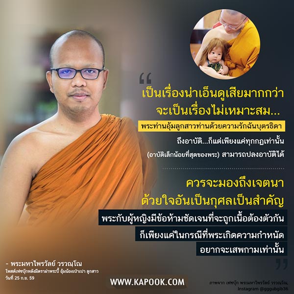 คือเราอาจจะสงสัยกันได้ แต่ก็ไม่ควรไปตั้งข้อรังเกียจกับประเด็นพวกนี้ ควรจะมองถึงเจตนาด้วยใจอันเป็นกุศล เป็นสำคัญ พระกับผู้หญิงมีข้อห้ามชัดเจนที่จะถูกเนื้อต้องตัวกัน ก็เพียงแค่ในกรณีที่พระเกิดความกำหนัดอยากจะเสพกามเท่านั้น อันนี้แม้เป็นเด็กไร้เดียงสา ท่านก็ปรับอาบัติหนักถึงสังฆาทิเสส ซึ่งมันไม่ใช่กับกรณีนี้ คนพุทธแบบบ้านเรานี่ บางทีก็ช่างจะสงสัย ช่างจะวิจารณ์ ช่างจะดราม่าในเรื่องไม่เป็นเรื่องเหมือนกันนะบางที"