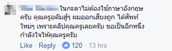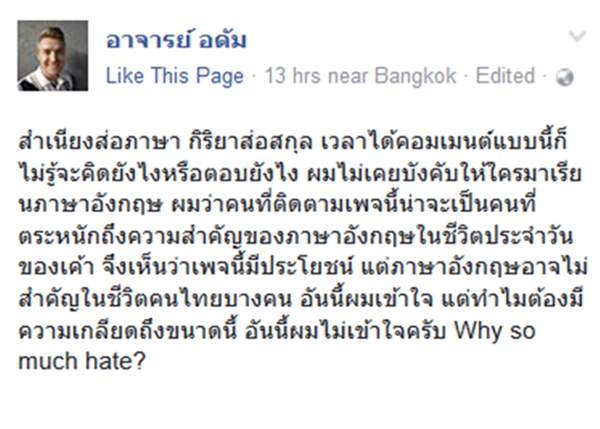 เรื่องนี้ทำเอาอาจารย์อดัมเองก็ได้ออกมาโพสต์ข้อความว่า... สำเนียงส่อภาษา กิริยาส่อสกุล ตนไม่เคยบังคับให้ใครเรียนภาษาอังกฤษ และคนที่ติดตามเพจนี้ก็น่าจะเป็นคนที่สนใจภาษาเป็นทุนเดิม ภาษาอังกฤษอาจจะไม่สำคัญสำหรับคนบางคน แต่ทำไมต้องเกลียดกันขนาดนี้ด้วย