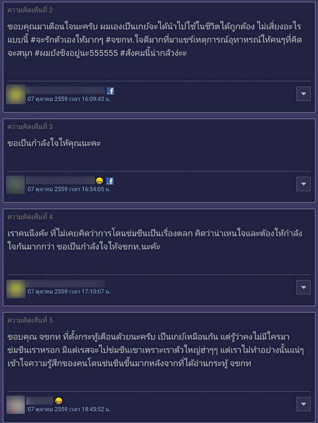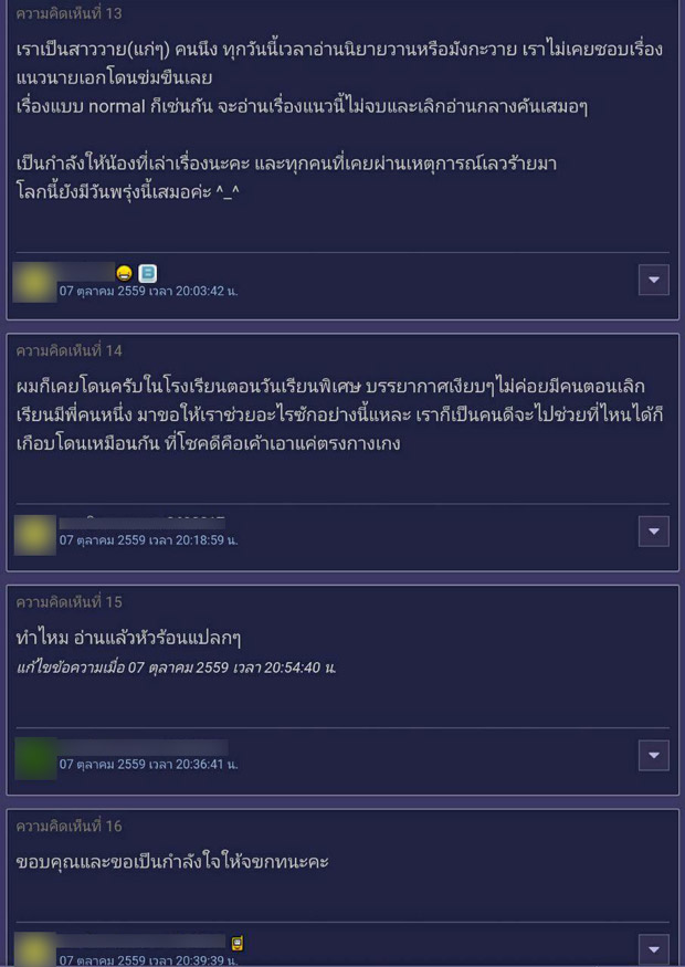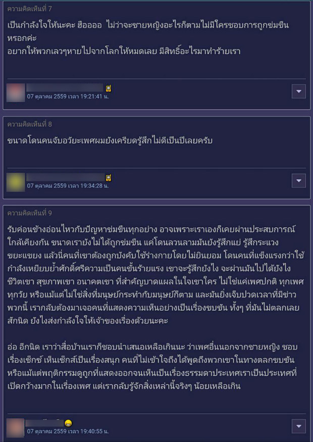 ทั้งนี้ได้มีชาวพันทิปเข้ามาร่วมแสดงความคิดเห็นเกี่ยวกับประเด็นดังกล่าวมากมาย ทั้งที่แสดงความเสียใจกับผู้ที่ต้องตกเป็นเหยื่อของการถูกข่มขืน ทั้งร่วมแชร์ประสบการณ์อันเจ็บปวด และมีกลุ่มผู้อ่านนิยายวาย (นิยายแนวชายรักชาย) เข้ามาร่วมแสดงความคิดเห็น ทั้งที่บอกว่า ในนิยายหรือการ์ตูนเป็นเพียงเรื่องสมมติที่แต่งขึ้นเพื่อความบันเทิงเท่านั้น ต้องแยกแยะให้ออกระหว่างความบันเทิงกับชีวิตจริง ขณะที่หลายคนก็บอกว่า แม้ตนจะอ่านนิยายวาย แต่หากเป็นเรื่องที่มีการข่มขืน ก็เลือกที่จะไม่อ่านและไม่สนับสนุนแต่อย่างใด