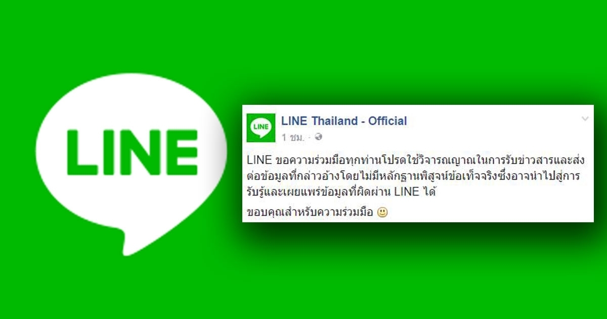 เฟซบุ๊ก LINE ประเทศไทย ออกประกาศขอความร่วมมือทุกคน ใช้วิจารณญาณในการรับ-ส่ง ข่าวสาร ที่ไม่มีหลักฐาน อาจนำไปสู่การเผยข้อมูลผิด