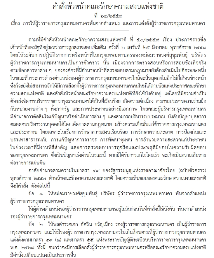 วันที่ 18 ตุลาคม 2559 พล.อ. ประยุทธ์ จันทร์โอชา ได้ใช้อํานาจตามความในมาตรา 44 ของรัฐธรรมนูญแห่งราชอาณาจักรไทย (ฉบับชั่วคราว) พ.ศ. 2557 ให้ ม.ร.ว.สุขุมพันธุ์ บริพัตร ผู้ว่าราชการกรุงเทพมหานคร พ้นจากตําแหน่งผู้ว่าราชการกรุงเทพมหานคร และให้ พล.ต.อ. อัศวิน ขวัญเมือง รองผู้ว่าราชการกรุงเทพมหานคร เป็นผู้ว่าราชการกรุงเทพมหานคร แทน