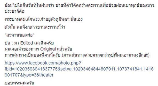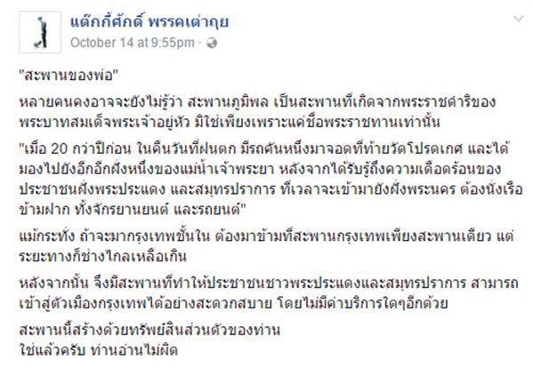เมื่อวันที่ 18 ตุลาคม 2559 เฟซบุ๊ก แต๊กกี้ศักดิ์ พรรคเต่าถุย ได้มีการเขียนบทความถึงสะพานภูมิพล พร้อมประวัติการสร้างสะพาน จนต้องเรียกว่า "สะพานของพ่อ" โดยรายละเอียดทั้งหมด มีดังนี้