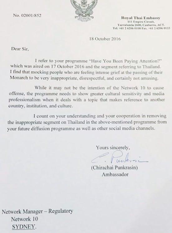 เมื่อวันที่ 18 ตุลาคม 2559 นายจิระชัย ปั้นกระษิณ เอกอัครราชทูตไทยประจำออสเตรเลีย ได้มีหนังสือไปยังสถานีโทรทัศน์เน็ตเวิร์ก 10 เพื่อท้วงติงรายการ "Have You Been Paying Attention?" ซึ่งออกอากาศไปเมื่อวันที่ 17 ตุลาคมที่ผ่านมา