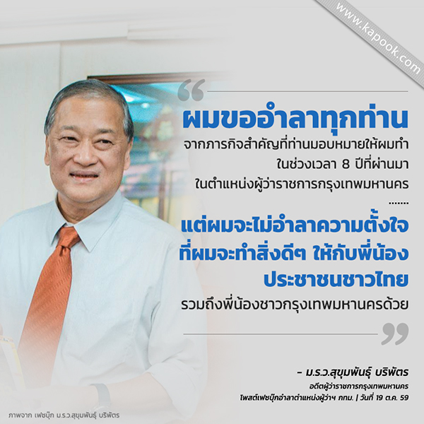 ล่าสุด วันที่ 19 ตุลาคม 2559 ม.ร.ว.สุขุมพันธุ์ บริพัตร อดีตผู้ว่าราชการกรุงเทพมหานคร ได้โพสต์ข้อความอำลาตำแหน่งผ่านเฟซบุ๊ก ม.ร.ว.สุขุมพันธุ์ บริพัตร พร้อมกับแสดงความยินดีและให้กำลังใจ พล.ต.อ. อัศวิน ขวัญเมือง และขอบคุณพี่น้องประชาชนที่ไว้วางใจให้ตนเองดำรงตำแหน่งผู้ว่าราชการกรุงเทพมหานคร 2 สมัย เป็นเวลาเกือบ 8 ปี รวมทั้งให้กำลังใจจนผ่านวิกฤตมาด้วยกันเสมอมาโดยมีข้อความทั้งหมดดังนี้