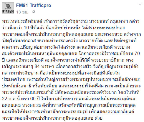 เฟซบุ๊ก FM91 Trafficpro รายงานว่า ที่วัดศรีสุดาราม ย่านบางขุนนนท์